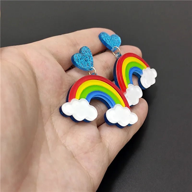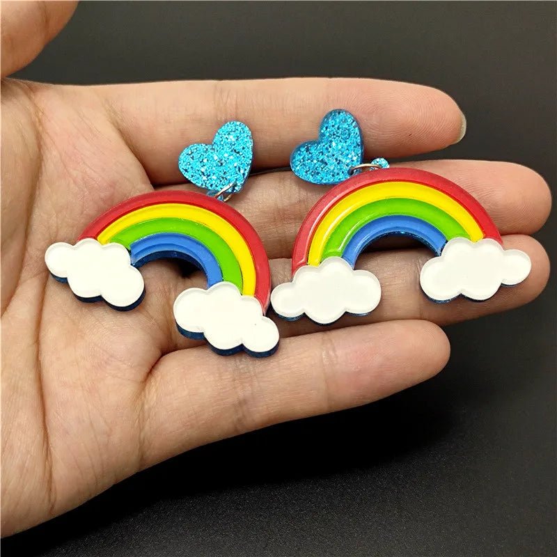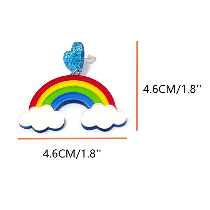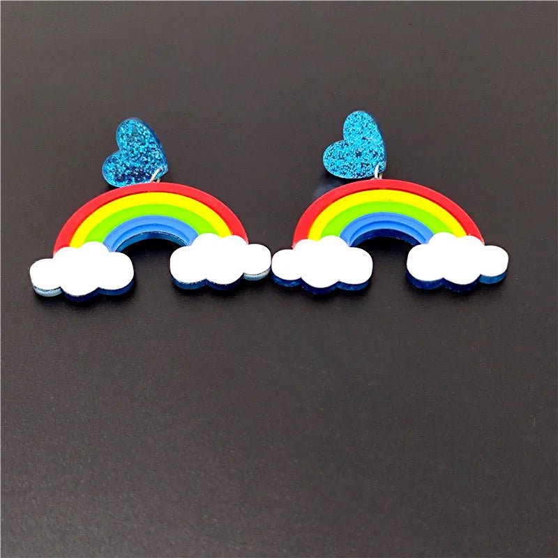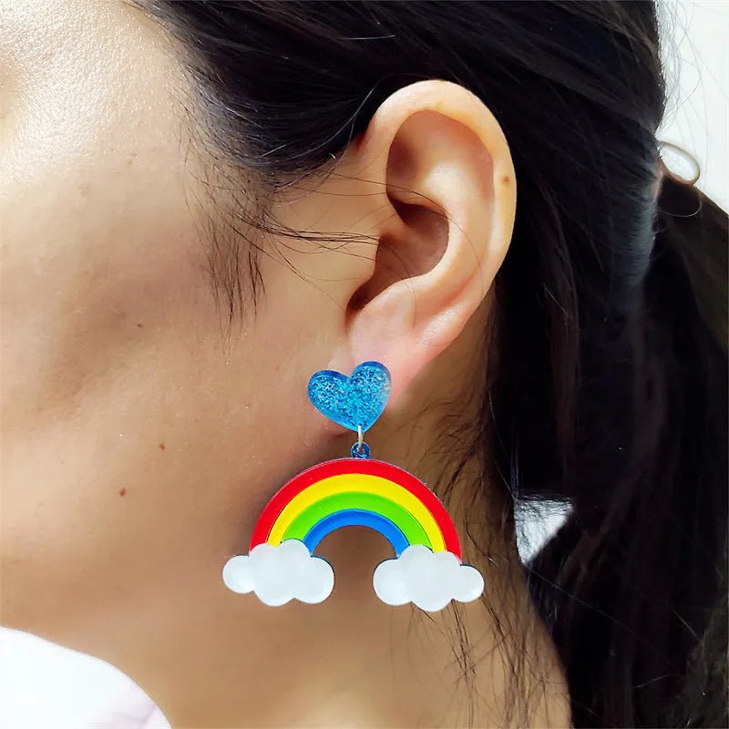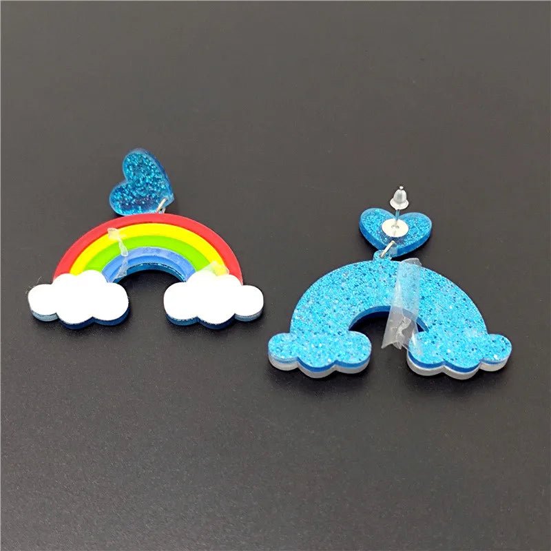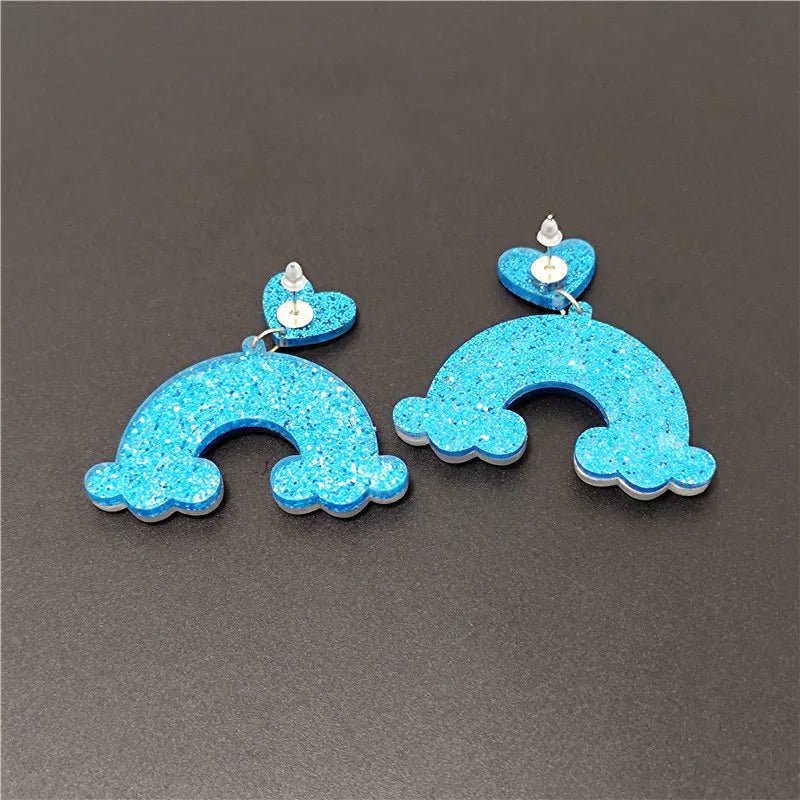 Colourful acrylic earrings featuring a blue glitter love heart, rainbow and white clouds - measuring 4.6cm x 4.6 cm. Stud earrings with drop design