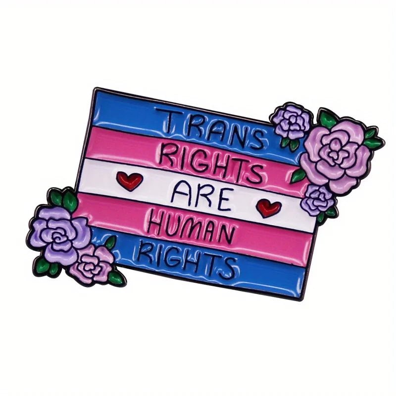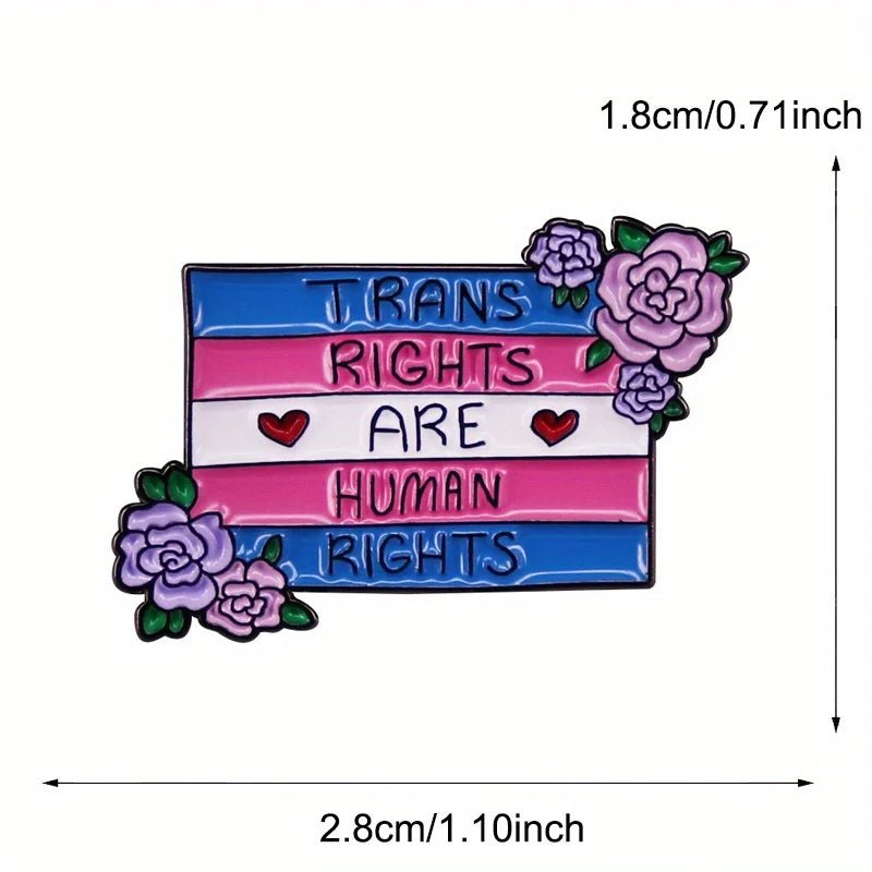 Trans Rights Are Human Rights trans pride flag and flowers enamel badge measuring1.8cm x 2.8cm